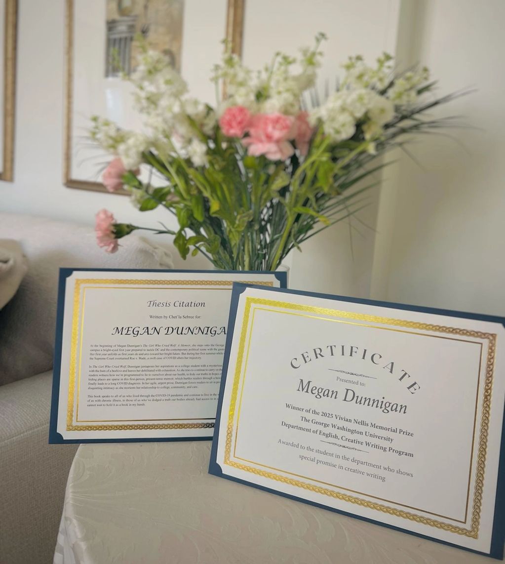 In 2025, Megan received the Vivian Nellis Memorial Prize, awarded by the creative writing faculty of The George Washington University for a student who shows excellence in the discipline.